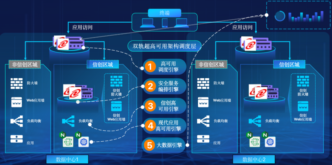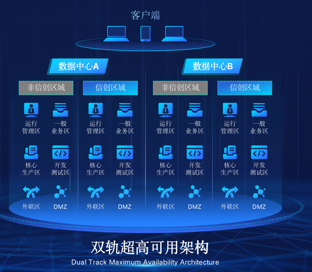 金年会诚信至上在企业面临自主创新IT基础重构过程中,推出的全新架构双轨超高可用架构(简称DTMAA),在双活数据中心的分区调度基础上,添加每个数据中心内信创域和非信创域的分域调度,来实现分区分域协同的多活双轨超高可用。
